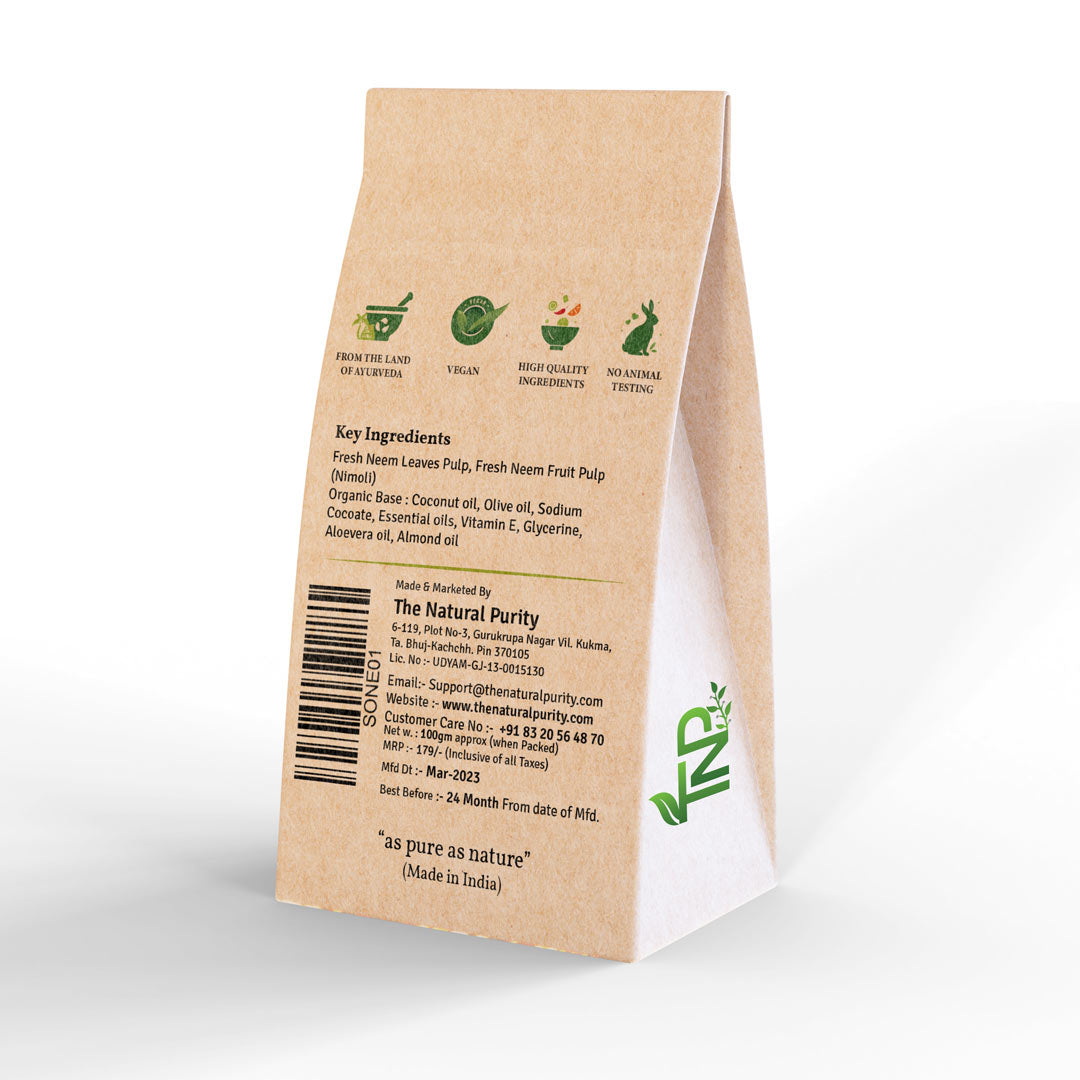 The Natural Purity Neem Bar is Made of Neem leaf and Nimboli Paste (Fruit of neem tree). and for the organic base, we use Virgin coconut oil, Essential neem oil, Vitamin E, Almond butter, Glycerine, Aloe vera tree Pulp, extra virgin olive oil,